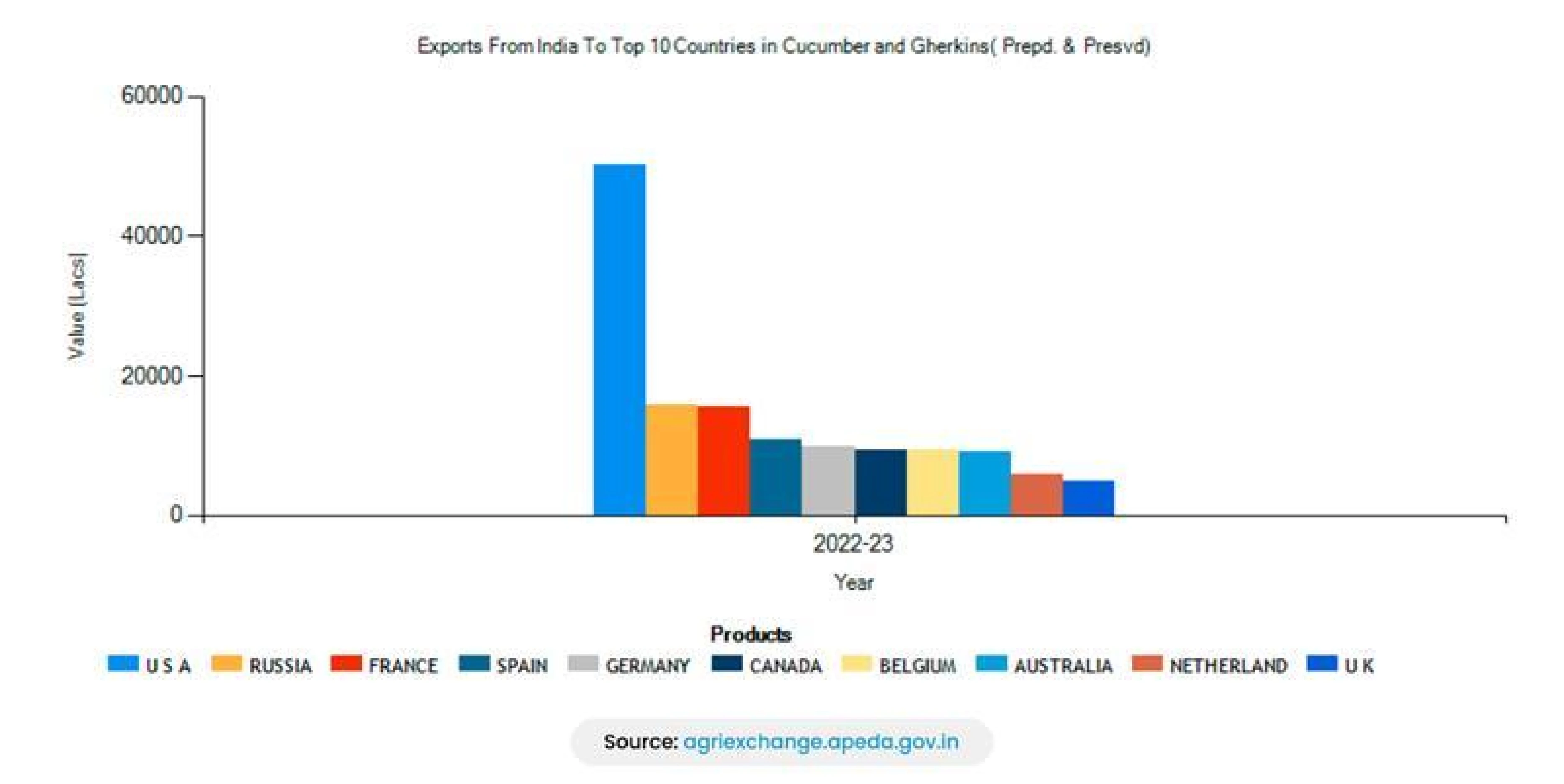 Indian gherkins have found a receptive market in several countries worldwide. The primary export destinations for Indian gherkins include the United States, the United Kingdom, Germany, Russia, and Australia. These countries recognize the quality and value of Indian gherkins, making them an integral part of their culinary traditions and preferences.